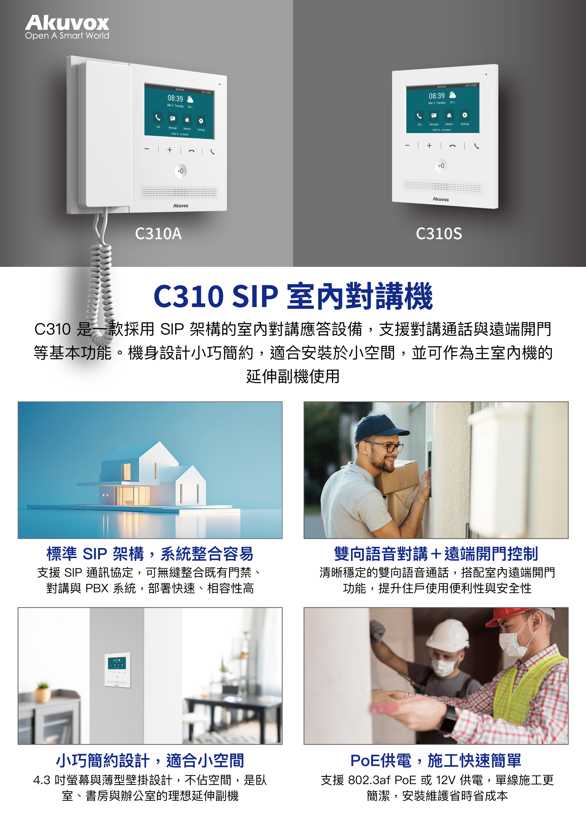 C310 是一款採用 SIP 架構的室內對講應答設備,支援對講通話與遠端開門等基本功能。機身設計小巧簡約,適合安裝於小空間,並可作為主室內機的延伸副機使用